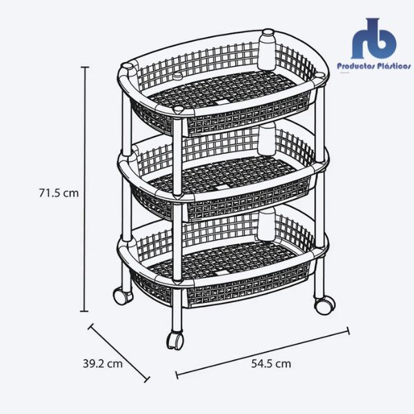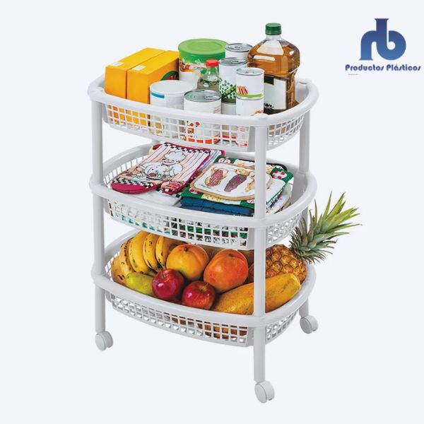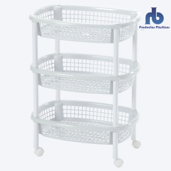 Canasta móvil ovalada que incluye tres niveles para organizar. Tiene rodachinas. Fácil de armar, no requiere herramientas. Ideal para organizar en casa todo tipo de objetos. No se oxida y es fácil de limpiar. Úsala en cocina, baños, cuartos de niños, como organizador auxiliar. Es tejida y permite oxigenar los productos o alimentos que guarde.