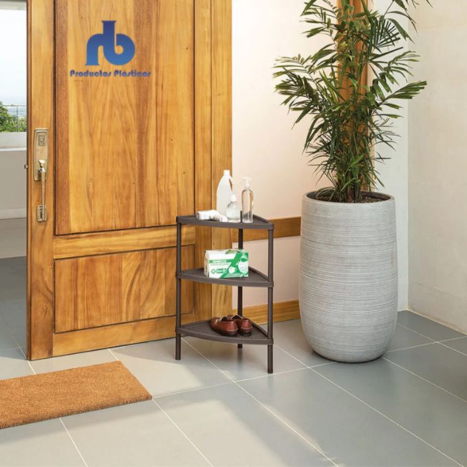 Mesa multiusos triangular con tejido decorativo y apariencia artesanal.